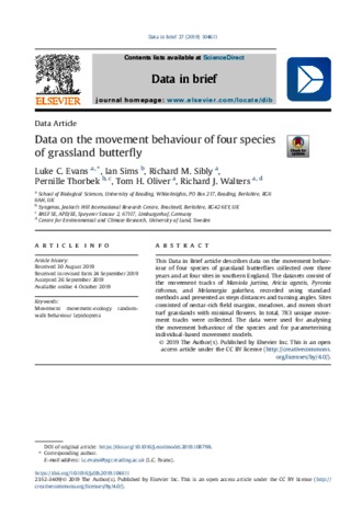 This Data in Brief article describes data on the movement behaviour of four species of grassland butterflies collected over three years and at four sites in southern England. The datasets consist of the movement tracks of and recorded using standard methods and presented as steps distances and turning angles. Sites consisted of nectar-rich field margins, meadows, and mown short turf grasslands with minimal flowers. In total, 783 unique movement tracks were collected. The data were used for analysing the movement behaviour of the species and for parameterising individual-based movement models.