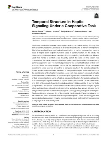 Haptic communication between humans plays an important role in society. Although this form of communication is ubiquitous at all levels of society and of human development, little is known about how synchronized coordination of motion between two persons leads to higher-order cognitive functions used in communication. In this study, we developed a novel experimental paradigm of a coin-collecting task in which participants used their hands to control a rod to jointly collect the coins on the screen. We characterized the haptic interactions between paired participants while they were taking part in a cooperative task. The individual participants first completed this task on their own and then with a randomly assigned partner for the cooperative task. Single participant experiments were used as a baseline to compare results of the paired participants. Forces applied to the rod were translated to four possible haptic states which encode the combination of the haptic interactions. As a next step, pairs of consecutive haptic states were then combined into 16 possible haptic signals which were classified in terms of their temporal patterns using a Tsallis q-exponential function. For paired participants, 80% of the haptic signals could be fit by the Tsallis q-exponential. On the other hand, only 30% of the signals found in the single-participant trials could be fit by the Tsallis q-exponential. This shows a clear difference in the temporal structures of haptic signals when participants are interacting with each other and when they are not. We also found 94 a large difference in the number of haptic signals used by paired participants and singles. Single participants only used 1/4 of the possible haptic signals. Paired participants, on the other hand, used more than half of the possible signals. These results suggest that temporal structures present in haptic communication could be linked to the emergence of language at an evolutionary level.