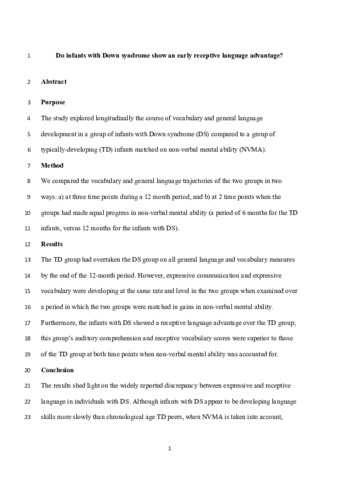 Mason-Apps, E., Stojanovik, V., Houston-Price, C., & Buckley, S. (2018). Longitudinal predictors of early language in infants with Down syndrome: A preliminary study. Research in Developmental Disabilities, 81, 37-51.