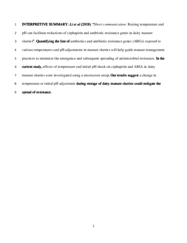 Increasing temperature and pH can facilitate reductions of cephapirin and antibiotic resistance genes in dairy manure slurries.