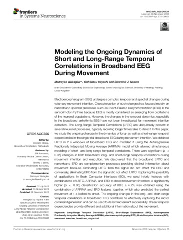 Wairagkar, M., Hayashi, Y. orcid id iconORCID: https://orcid.org/0000-0002-9207-6322 and Nasuto, S. J. orcid id iconORCID: https://orcid.org/0000-0001-9414-9049 (2019) Modeling the ongoing dynamics of short and long-range temporal correlations in broadband EEG during movement. Frontiers in Systems Neuroscience, 13 (66). ISSN 1662-5137 doi: 10.3389/fnsys.2019.00066