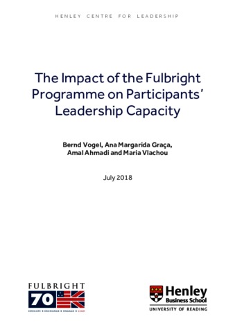 The Henley Centre for Leadership at Henley Business School, University of Reading, partnered with the US–UK Fulbright Commission, UK, to conduct a study with the aim of capturing and evaluating the impact that the experience of the Fulbright award has on its students’ and alumni’s leadership capacity – both during the award period and in the mid to long term, over the alumni’s careers. This research explores: the extent to which the Fulbright award helps to develop leadership capacity in programme members; what type of leadership capacity and tangible leadership behaviour is developed during the award; and how Fulbright students and alumni use this learning in their areas of responsibility and influence. The study utilises in-depth interviews with thirty-nine UK and US Fulbright students from a range of backgrounds and industries. In doing so, the study takes into account individual, contextual and programme factors that influence the impact of the Fulbright programme. The study derives the following headline insights:  Part 2 shows that none of the interviewees had originally considered the enhancement of leadership capabilities to be part of the Fulbright experience. Nevertheless, the study consistently found that Fulbright influences the development of both personal growth in underlying developmental factors (such as core beliefs, confidence, experimentation, proactivity and identity) that function as generic precursors of leadership capabilities, and leadership capacities of attitudes, skills and behaviours. Such development builds not only on activities, events and processes directly provided by Fulbright, but also on the studies and experiences that are made possible by Fulbright through their award programmes. Fulbright alumni also collectively show a distinct understanding of what leadership means to them along a set of individual and relational attributes, as well as an understanding of leadership as a collective process with broad focus and outcomes (see Figure 1, page 8, for an overview).  Part 3 highlights findings of how the Fulbright programme (pre, during and post award) influences the development of leadership capacity (see Figure 2, page 43, for an overview). The findings show: • how the Fulbright experience helped students to develop how they see themselves as leaders (heightened self-awareness; self-confidence; personal purpose and career trajectory; experimenting, autonomy and risk taking; proactivity; and resilience); • how the Fulbright experience helped students to develop leadership in situations of working with others (empathy; relationship skills; inspiring and involving others; speaking up; supporting others; and building confidence in others); • how the Fulbright experience developed students’ leadership regarding wider society and intercultural diversity (multicultural diversity and inclusion; legitimacy for voice and action; multidisciplinary diversity; tolerance; critical and independent inquiry; purposeful and outward-focused research; and humility and gratitude, for giving back to society). Furthermore, findings point to the impact of students’ changes in leadership capacity on their lives and careers. These findings revolve around students’ identity transformations, their personal and professional trajectories, and their continuous preference for experiences with multicultural contexts. The findings also revolve around Fulbright being a continuous resource with long-term impacts on inclusive, multicultural leadership capacity.  Part 4 offers a set of distinct conclusions and recommendations separated into the following periods: • pre-programme – for example: encourage students who see themselves as a non-fit to apply; identify candidates’ motivation to experiment with leadership; sustain multi-layered diversity in cohorts • during programme – for example: create awareness of leadership learning at programme start; provide a Fulbright ‘philosophy of leadership’ • post-programme – for example: strategic shift of Fulbright activities to the post-award phase; leadership learning element of programme debrief; continuous post-programme reflexive activities for personal growth These conclusions provide a springboard to consider future initiatives that advance the leadership capacity outcome of the Fulbright journey (see Figure 3, page 46).