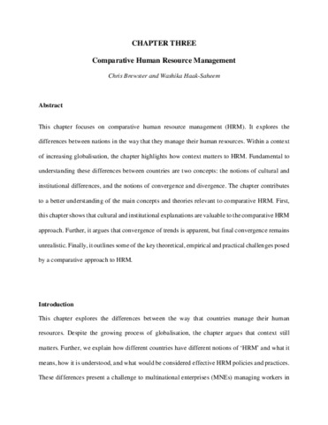 This chapter focuses on comparative human resource management (HRM). It explores the differences between nations in the way that they manage their human resources. Within a context of increasing globalisation, the chapter highlights how context matters to HRM. Fundamental to understanding these differences between countries are two concepts: the notions of cultural and institutional differences, and the notions of convergence and divergence. The chapter contributes to a better understanding of the main concepts and theories relevant to comparative HRM. First, this chapter shows that cultural and institutional explanations are valuable to the comparative HRM approach. Further, it argues that convergence of trends is apparent, but final convergence remains unrealistic. Finally, it outlines some of the key theoretical, empirical and practical challenges posed by a comparative approach to HRM.