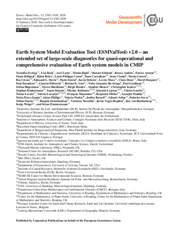 Eyring, V., Bock, L., Lauer, A., Righi, M., Schlund, M., Andela, B., Arnone, E., Bellprat, O., Brötz, B., Caron, L.-P., Carvalhais, N., Cionni, I., Cortesi, N., Crezee, B., Davin, E., Davini, P., Debeire, K., de Mora, L., Deser, C., Docquier, D., Earnshaw, P., Ehbrecht, C., Gier, B. K., Gonzalez-Reviriego, N., Goodman, P., Hagemann, S., Hardiman, S., Hassler, B., Hunter, A., Kadow, C., Kindermann, S., Koirala, S., Koldunov, N. V., Lejeune, Q., Lembo, V., Lovato, T., Lucarini, V. orcid id iconORCID: https://orcid.org/0000-0001-9392-1471, Massonnet, F., Müller, B., Pandde, A., Pérez-Zanón, N., Phillips, A., Predoi, V., Russell, J., Sellar, A., Serva, F., Stacke, T., Swaminathan, R. orcid id iconORCID: https://orcid.org/0000-0001-5853-2673, Torralba, V., Vegas-Regidor, J., von Hardenberg, J., Weigel, K. and Zimmermann, K. (2020) Earth System Model Evaluation Tool (ESMValTool) v2.0 – an extended set of large-scale diagnostics for quasi-operational and comprehensive evaluation of Earth system models in CMIP. Geoscientific Model Development Discussions, 13 (7). pp. 3383-3438. ISSN 1991-962X doi: 10.5194/gmd-13-3383-2020
