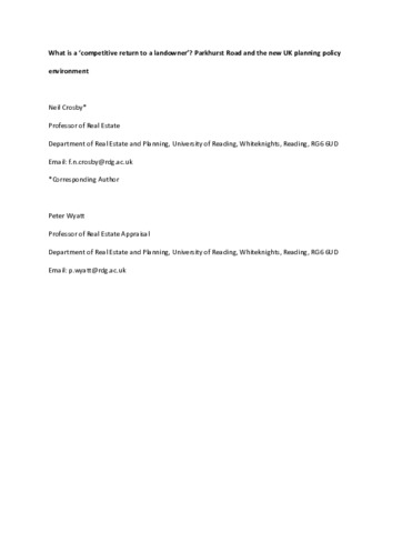 | Uncontrolled Keywords | UK; development viability assessment; landowner return; development appraisal; planning obligations |
