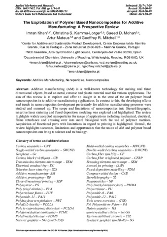 Khan, I., Kamma-Lorger, C. S., Mohan, S. D., Mateus, A. and Mitchell, G. R. (2019) The exploitation of polymer based nanocomposites for additive manufacturing: a prospective review. Applied Mechanics and Materials, 890. pp. 113-145. ISSN 1662-7482 doi: 10.4028/www.scientific.net/amm.890.113