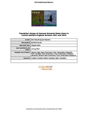 Capsule: Distance sampling identified an increase in estimated population size of Common Buzzards Buteo buteo in central southern England between 2011 and 2016 of more than 50%. The rate of population growth slowed in later years. Aims: To assess the utility of a targeted distance sampling protocol to derive seasonal and annual population estimates for Common Buzzards across an area of southern England. Methods: We used a line transect survey methodology and multiple covariate distance sampling to assess population density and abundance of Common Buzzards in spring and autumn between 2011 and 2016 across a 2600 km2 area of central southern England. Results: Estimated population size increased by more than 50%, from approximately 2900 to 4500 individuals, across the period in a trend similar to that shown by Breeding Bird Survey data. Discussion: A slowing of the growth in population size of Common Buzzards in central southern England suggests that the species may be approaching carrying capacity in this area. These results also suggest that currently employed broad scale survey methodologies adequately reflect the general population trends for this species. Our data provide the first published estimates of the Common Buzzard population in central southern England derived from direct empirical assessment.