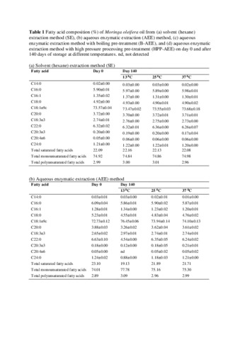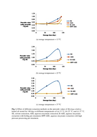BACKGROUND Moringa oleifera (MO) kernel oil is categorized as high‐oleic oil which resembles olive oil. However, different from olive, MO trees are largely available in most subtropical and tropical countries. Therefore, in these countries, the benefits of oleic acid can be obtained at a cheaper price through consumption of MO kernel oil. This study reports on the effect of different extraction methods on oxidative properties of MO kernel oil during storage for 140 days at 13 0C, 25 0C, and 37 0C. RESULTS All aqueous enzymatic extraction (AEE)‐based methods generally resulted in oil with better oxidative properties and higher tocopherol retention than the use of solvent. Prior to AEE, boiling pre‐treatment deactivated the hydrolytic enzymes and preserved the oil quality. In contrast, high pressure processing (HPP) pre‐treatment accelerated hydrolytic reaction and resulted in higher free fatty acids after 140 days at all temperatures. No significant changes were detected in the oils' iodine values and fatty acid compositions. The tocopherol contents decreased significantly at both 13 0C and 25 0C after 60 days in the oil from SE method, and after 120 days in oils from AEE‐based methods. CONCLUSION These findings are significant in highlighting the extraction method resulting in crude MO kernel oil with greatest oxidative stability in the storage conditions tested. Subsequently, the suitable storage condition of the oil prior to refining can be determined. Further studies are recommended in determining the suitable refining processes and parameters for the MO kernel oil prior to application in variety food products.