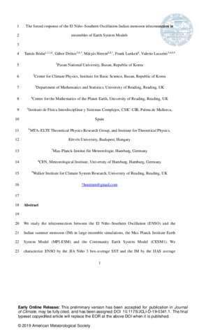 Bodai, T., Drótos, G., Herein, M., Lunkeit, F. and Lucarini, V. orcid id iconORCID: https://orcid.org/0000-0001-9392-1471 (2020) The forced response of the El Niño–Southern Oscillation-Indian monsoon teleconnection in ensembles of Earth System Models. Journal of Climate, 33. pp. 2163-2182. ISSN 1520-0442 doi: 10.1175/JCLI-D-19-0341.1