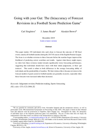 • Brown, A., and J. J. Reade. 2018. “The wisdom of amateur crowds: Evidence from an online community of sports tipsters.” European Journal of Operational Research, forthcoming.