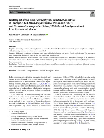 First report of the ticks Haemaphysalis punctata Canestrini et Fanzago, 1878, Haemaphysalis parva (Neumann, 1897) and Dermacentor marginatus (Sulzer, 1776) (Acari, Amblyommidae) from humans in Lebanon.