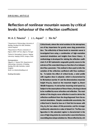Teixeira, M. A. C. orcid id iconORCID: https://orcid.org/0000-0003-1205-3233, Argain, J. L. and Xu, X. (2020) Reflection of nonlinear mountain waves by critical levels: behaviour of the reflection coefficient. Quarterly Journal of the Royal Meteorological Society, 146 (727). pp. 1009-1025. ISSN 1477-870X doi: 10.1002/qj.3722