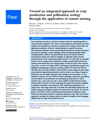 Willcox, B. K., Robson, A. J., Howlett, B. G. and Rader, R. (2018) Toward an integrated approach to crop production and pollination ecology through the application of remote sensing. PeerJ, 2018 (6). e5806. ISSN 2167-8359 doi: 10.7717/peerj.5806