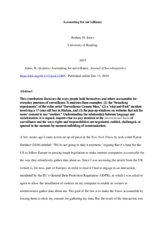 This contribution discusses the ways people hold themselves and others accountable for everyday practices of surveillance. It analyses three examples: (1) the “breeching experiments” of the video artist “Surveillance Camera Man,” (2) a “stop and frisk” incident involving a 17‐year‐old boy in Harlem, and (3) the pop‐up windows on websites that ask for users’ consent to use “cookies.” Understanding the relationship between language and securitization, it is argued, requires that we pay attention to the interactional basis of surveillance and the ways rights and responsibilities are negotiated, ratified, challenged, or ignored in the moment‐by‐moment unfolding of communication.