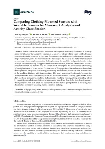 Jayasinghe, U., Harwin, W. S. orcid id iconORCID: https://orcid.org/0000-0002-3928-3381 and Hwang, F. orcid id iconORCID: https://orcid.org/0000-0002-3243-3869 (2019) Comparing clothing-mounted sensors with wearable sensors for movement analysis and activity classification. Sensors, 20 (1). 82. ISSN 1424-8220 doi: 10.3390/s20010082