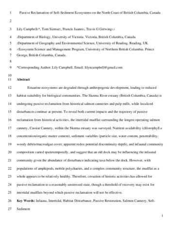 Passive reclamation of soft-sediment ecosystems on the North Coast of British Columbia, Canada.