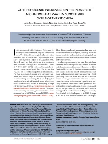 Ren, L., Wang, D., An, N., Ding, S., Yang, K., Yu, R., Freychet, N., Tett, S. F. B., Dong, B. orcid id iconORCID: https://orcid.org/0000-0003-0809-7911 and Lott, F. C. (2020) Anthropogenic influences on the persistent night-time heat wave in summer 2018 over North-East China. Bulletin of the American Meteorological Society, 101 (1). S83-S88. ISSN 1520-0477 doi: 10.1175/BAMS-D-19-0152.1