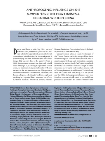 Anthropogenic influence on 2018 summer persistent heavy and daily extreme rainfall in central western China.