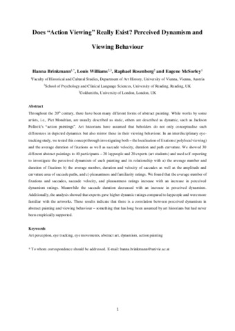 Brinkmann, H., Williams, L., McSorley, E. orcid id iconORCID: https://orcid.org/0000-0002-2054-879X and Rosenberg, R. (2020) Does ‘action viewing’ really exist? Perceived dynamism and viewing behaviour. Art and Perception, 8 (1). pp. 27-48. ISSN 2213-4913 doi: 10.1163/22134913-20191128