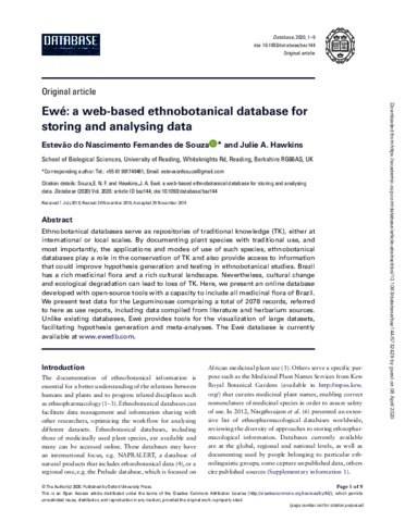 Ethnobotanical databases serve as repositories of traditional knowledge (TK), either at international or local scales. By documenting plant species with traditional use, and most importantly, the applications and modes of use of such species, ethnobotanical databases play a role in the conservation of TK and also provide access to information that could improve hypothesis generation and testing in ethnobotanical studies. Brazil has a rich medicinal flora and a rich cultural landscape. Nevertheless, cultural change and ecological degradation can lead to loss of TK. Here, we present an online database developed with open-source tools with a capacity to include all medicinal flora of Brazil. We present test data for the Leguminosae comprising a total of 2078 records, referred to here as use reports, including data compiled from literature and herbarium sources. Unlike existing databases, Ewé provides tools for the visualization of large datasets, facilitating hypothesis generation and meta-analyses. The Ewé database is currently available at www.ewedb.com.