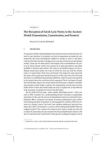 The reception of Greek lyric poetry in the ancient world: transmission, canonization, and paratext.