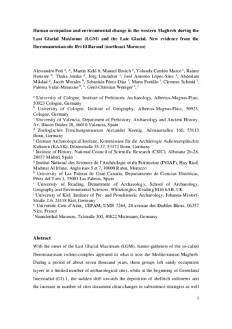 Potì, A., Kehl, M., Broich, M., Carrión Marco, Y., Hutterer, R., Jentke, T., Linstädter, J., López-Sáez, J. A., Mikdad, A., Morales, J., Pérez-Díaz, S., Portillo Ramirez, M., Schmid, C., Vidal-Matutano, P. and Weniger, G.-C. (2019) Human occupation and environmental change in the western Maghreb during the Last Glacial Maximum (LGM) and the Late Glacial. New evidence from the Iberomaurusian site Ifri El Baroud (northeast Morocco). Quaternary Science Reviews, 220. pp. 87-110. ISSN 0277-3791 doi: 10.1016/j.quascirev.2019.07.013