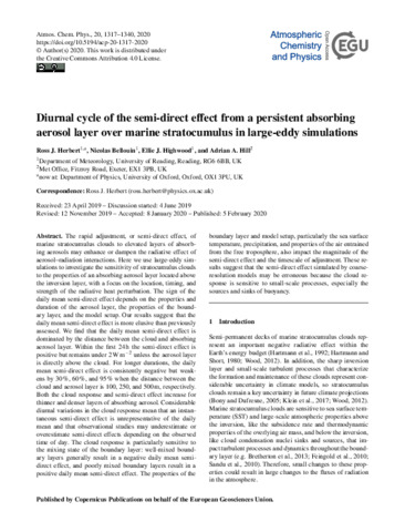 Herbert, R., Bellouin, N. orcid id iconORCID: https://orcid.org/0000-0003-2109-9559, Highwood, E. and Hill, A. (2020) Diurnal cycle of the semi–direct effect from a persistent absorbing aerosol layer over marine stratocumulus in large–eddy simulations. Atmospheric Chemistry and Physics. ISSN 1680-7316 doi: 10.5194/acp-20-1317-2020