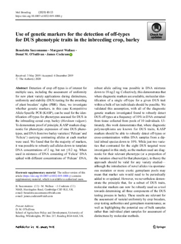 Saccomanno, B., Wallace, M., O'Sullivan, D. M. orcid id iconORCID: https://orcid.org/0000-0003-4889-056X and Cockram, J. (2020) Use of genetic markers for the detection of off-types for DUS phenotypic traits in the inbreeding crop, barley. Molecular Breeding, 40 (1). ISSN 1380-3743 doi: 10.1007/s11032-019-1088-y
