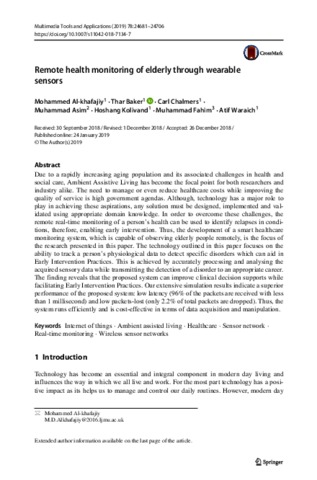Remote health monitoring of elderly through wearable sensors.