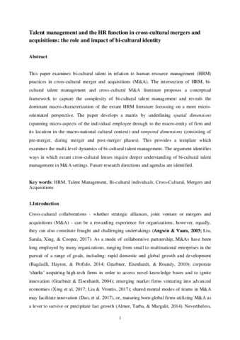 This paper examines bi-cultural talent in relation to human resource management (HRM) practices in cross-cultural merger and acquisitions (M&A). The intersection of HRM, bi-cultural talent management and cross-cultural M&A literature proposes a conceptual framework to capture the complexity of bi-cultural talent management and reveals the dominant macro-characterization of the extant HRM literature focussing on a more micro-orientated perspective. The paper develops a matrix by underlining spatial dimensions (spanning micro-aspects of the individual employee through to the macro-entity of firm and its location in the macro-national cultural context) and temporal dimensions (consisting of pre-merger, during merger and post-merger phases). This provides a template which examines the multi-level dynamics of bi-cultural talent management. The argument identifies ways in which extant cross-cultural lenses require deeper understanding of bi-cultural talent management in M&A settings. Future research directions and agendas are identified.