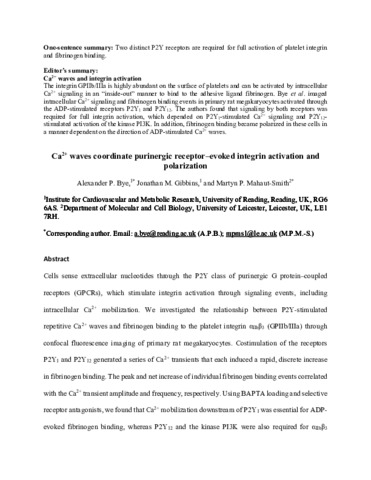 • A. R. Hardy, M. L. Jones, S. J. Mundell, A. W. Poole, Reciprocal cross-talk between P2Y1 and P2Y12 receptors at the level of calcium signaling in human platelets. Blood 104, 1745-1752 (2004); published online EpubSep 15 (10.1182/blood-2004-02-0534).