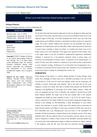 Darbre, P. (2019) Breast cysts and aluminium-based antiperspirant salts. Clinical Dermatology: Research and Therapy, 2 (1). 128.