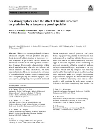 Sex demographics alter the effect of habitat structure on predation by a temporary pond specialist.