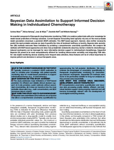 Maier, C., Hartung, N., de Wiljes, J., Kloft, C. and Huisinga, W. (2020) Bayesian data assimilation to support informed decision-making in individualized chemotherapy. CPT: Pharmacometrics & Systems Pharmacology, 9 (3). pp. 153-164. ISSN 2163-8306 doi: 10.1002/psp4.12492