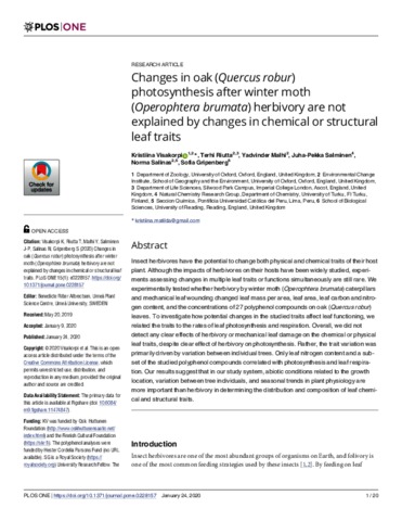 Changes in oak (Quercus robur) photosynthesis after winter moth (Operophtera brumata) herbivory are not explained by changes in chemical or structural leaf traits.