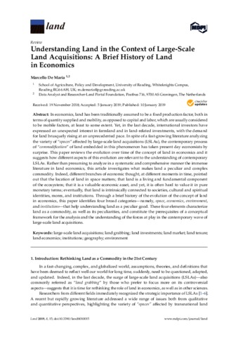 In economics, land has been traditionally assumed to be a fixed production factor, both in terms of quantity supplied and mobility, as opposed to capital and labor, which are usually considered to be mobile factors, at least to some extent. Yet, in the last decade, international investors have expressed an unexpected interest in farmland and in land-related investments, with the demand for land brusquely rising at an unprecedented pace. In spite of a fast-growing literature analyzing the variety of “spaces” affected by large-scale land acquisitions (LSLAs), the contemporary process of “commodification” of land embedded in this phenomenon has taken present day economists by surprise. This paper reviews the evolution over time of the concept of land in economics and it suggests how different aspects of this evolution are relevant to the understanding of contemporary LSLAs. Rather than presuming to analyze in a systematic and comprehensive manner the immense literature in land economics, this article investigates what makes land a peculiar and complex commodity. Indeed, different branches of economic thought, at different moments in time, pointed out that the location of land in space matters; that land is a living and fundamental component of the ecosystem; that it is a valuable economic asset, and yet, it is often hard to value it in pure monetary terms; eventually, that land is intrinsically connected to societies, cultural and spiritual identities, mores, and institutions. Through a brief history of the evolution of the concept of land in economics, this paper identifies four broad categories—namely, space, economics, environment, and institutions—that help understanding land as a peculiar good. These four elements characterize land as a commodity, as well as its peculiarities, and constitute the prerequisites of a conceptual framework for the analysis and the understanding of the forces at play in the contemporary wave of large-scale land acquisitions.
