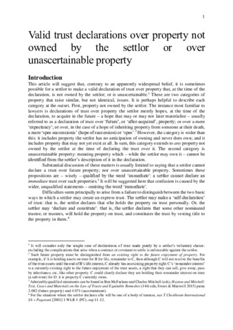 It seems to be widely believed that settlors can never make valid declarations of trust over property that, at the time of the declaration, they do not own; or which is unascertainable then. It is argued that this is a misconception: arising from a failure to distinguish between (1) rules applicable to self-declarations of trust and (2) rules applicable to declarations of trust to be constituted by vesting title to property in others as trustees.