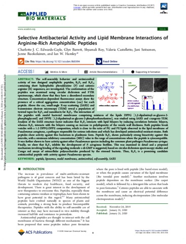 Selective antibacterial activity and lipid membrane interactions of arginine-rich amphiphilic peptides.