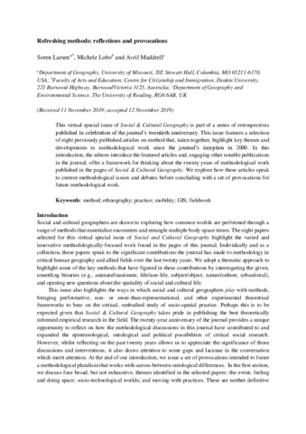 This virtual special issue of Social & Cultural Geography is part of a series of retrospectives published in celebration of the journal’s twentieth anniversary. This issue features a selection of eight previously published articles on method that, taken together, highlight key themes and developments in methodological work since the journal’s inception in 2000. In this introduction, the editors introduce the featured articles and, engaging other notable publications in the journal, offer a framework for thinking about the twenty years of methodological work published in the pages of Social & Cultural Geography. We explore how these articles speak to current methodological issues and debates before concluding with a set of provocations for future methodological work.