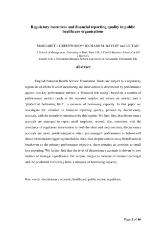 English National Health Service Foundation Trusts are subject to a regulatory regime in which the level of monitoring and intervention is determined by performance against two key performance metrics: a ‘financial risk rating’, based on a number of performance metrics, such as the reported surplus margin and return on assets, and a ‘prudential borrowing limit’. In this paper, we investigate the variation in financial reporting quality, proxied by discretionary accruals, with the incentives introduced by this regime. We find: first, that discretionary accruals are managed to report small surpluses; second, that, consistent with the avoidance of regulatory intervention in both the short and medium term, discretionary accruals are more positive when pre-managed performance is below intervention triggering thresholds and more negative when well above threshold; third, that, despite a move away from financial breakeven as the primary performance objective, there remains an aversion to small loss reporting. We further find that the level of discretionary accruals is driven by two metrics of strategic significance: the surplus margin (a measure of retained earnings) and the prudential borrowing limit (a measure of borrowing capacity).
