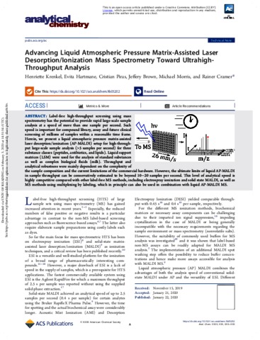 Krenkel, H., Hartmane, E., Piras, C., Brown, J., Morris, M. and Cramer, R. orcid id iconORCID: https://orcid.org/0000-0002-8037-2511 (2020) Advancing liquid atmospheric pressure matrix-assisted laser desorption/ionization mass spectrometry toward ultra-high-throughput analysis. Analytical Chemistry, 92 (4). pp. 2931-2936. ISSN 0003-2700 doi: 10.1021/acs.analchem.9b05202