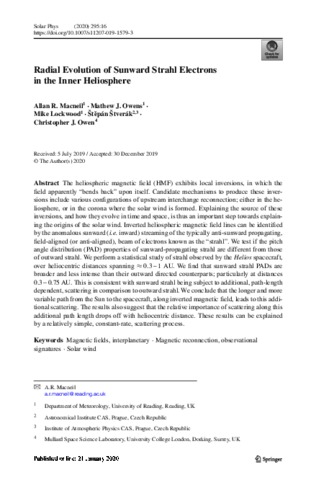 Macneil, A. R., Owens, M. J. orcid id iconORCID: https://orcid.org/0000-0003-2061-2453, Lockwood, M. J. orcid id iconORCID: https://orcid.org/0000-0002-7397-2172, Štverák, Š. and Owen, C. J. (2020) Radial evolution of sunward strahl electrons in the inner heliosphere. Solar Physics, 295 (16). ISSN 0038-0938 doi: 10.1007/s11207-019-1579-3