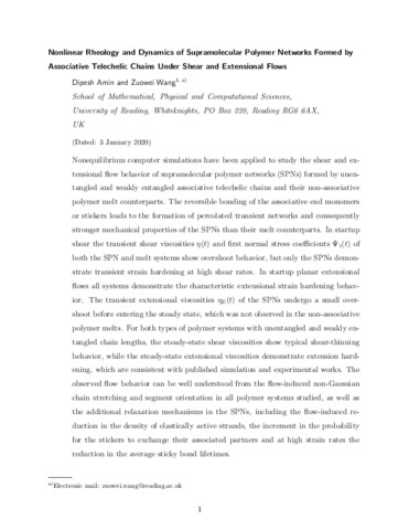 Amin, D. and Wang, Z. (2020) Nonlinear rheology and dynamics of supramolecular polymer networks formed by associative telechelic chains under shear and extensional flows. Journal of Rheology, 64 (3). pp. 581-600. ISSN 1520-8516 doi: 10.1122/1.5120897