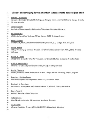 Merryfield, W. J., Baehr, J., Batte, L., Becker, E. J., Butler, A. H., Coelho, C. A., Danabasoglu, G., Dirmeyer, P. A., Doblas-Reyes, F. J., Domeisen, D. I., Ferranti, L., Ilynia, T., Kumar, A., Muller, W. A., Rixen, M., Robertson, A. W., Smith, D. M., Takaya, Y., Tuma, M., Vitart, F., White, C. J., Alvarez, M. S., Ardilouze, C., Attard, H., Baggett, C., Balmaseda, M. A., Beraki, A. F., Battacharjee, P. S., Bilbao, R., Marques De Andrade, F., DeFlorio, M. J., Diaz, L. B., Ehsan, M. A., Frangkoulidis, G., Grainger, S., Green, B. W., Hell, M. C., Infanti, J. M., Isensee, K., Kataoka, T., Kirtman, B. P., Klingaman, N. P. orcid id iconORCID: https://orcid.org/0000-0002-2927-9303, Lee, J.-Y., Mayer, K., McKay, R., Mecking, J., Miller, D. E., Neddermann, N., Ng, C. H., Osso, A., Pankatz, K., Peatman, S., Pegion, K., Perwitz, J., Raclade-Coronel, G. C., Reintges, A., Renkl, C., Solaraju-Murali, B., Spring, A., Stan, C., Sun, Y. Q., Tozer, C. R., Vigaud, N., Woolnough, S. orcid id iconORCID: https://orcid.org/0000-0003-0500-8514 and Yeager, S. (2020) Current and emerging developments in subseasonal to decadal prediction. Bulletin of the American Meteorological Society, 101 (6). E869-E896. ISSN 1520-0477 doi: 10.1175/BAMS-D-19-0037.1
