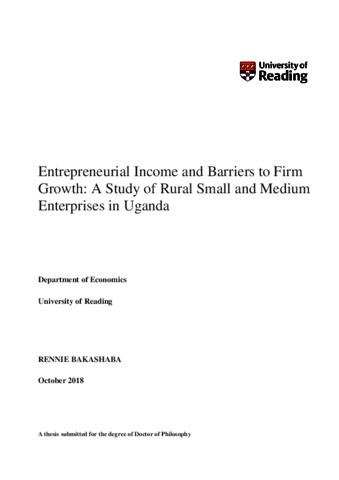 Bakashaba, R. (2019) Entrepreneurial income and barriers to firm growth: a study of rural small and medium enterprises in Uganda. PhD thesis, University of Reading. doi: 10.48683/1926.00088810
