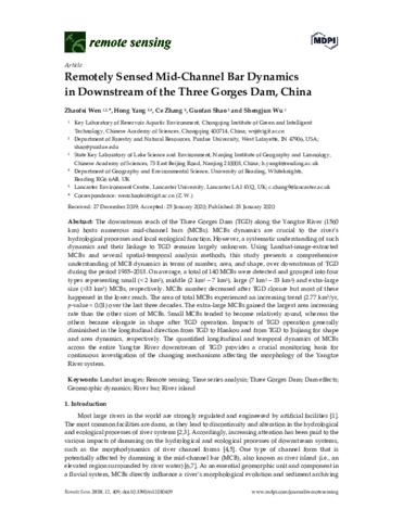 Wen, Z., Yang, H. orcid id iconORCID: https://orcid.org/0000-0001-9940-8273, Zhang, C., Shao, G. and Wu, S. (2020) Remotely sensed mid-channel bar dynamics in downstream of the Three Gorges Dam, China. Remote Sensing, 12 (3). e409. ISSN 2072-4292 doi: 10.3390/rs12030409