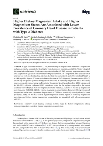 Gant, C. M., Soedamah-Muthu, S. S., Binnenmars, S. H., Bakker, S. J. L., Navis, G. and Laverman, G. D. (2018) Higher dietary magnesium intake and higher magnesium status are associated with lower prevalence of coronary heart disease in patients with Type 2 Diabetes. Nutrients, 10 (3). 307. ISSN 2072-6643 doi: 10.3390/nu10030307