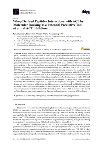 Chamata, Y., Watson, K. A. orcid id iconORCID: https://orcid.org/0000-0002-9987-8539 and Jauregi, P. (2020) Whey-derived peptides interactions with ACE by molecular docking as a potential predictive tool of natural ACE inhibitors. International Journal of Molecular Sciences, 21 (3). e864. ISSN 1422-0067 doi: 10.3390/ijms21030864
