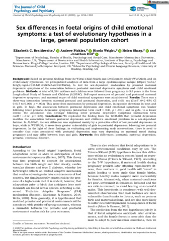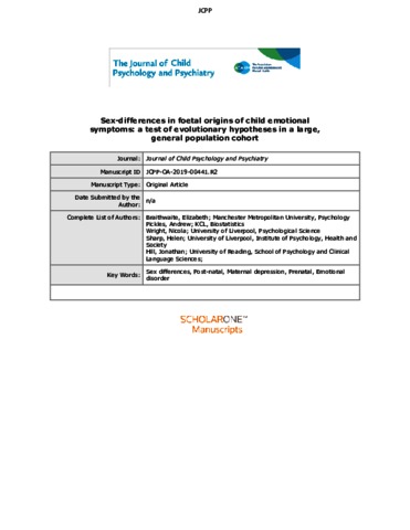 Braithwaite, E. C., Pickles, A., Wright, N., Sharp, H. and Hill, J. (2020) Sex differences in foetal origins of child emotional symptoms: a test of evolutionary hypotheses in a large, general population cohort. Journal of Child Psychology and Psychiatry, 61 (11). pp. 1194-1202. ISSN 0021-9630 doi: 10.1111/jcpp.13229
