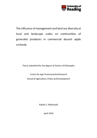 McDonald, R. (2019) The influence of management and land use diversity at local and landscape scales on communities of generalist predators in commercial dessert apple orchards. PhD thesis, University of Reading. doi: 10.48683/1926.00088900